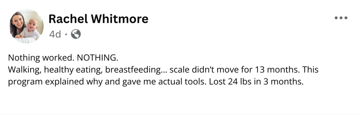Results Disclaimer: Individual weight loss results will vary and depend on many factors including but not limited to: your starting weight, how much you're nursing, sleep quality, stress levels, underlying health conditions (thyroid, PCOS, etc.), how closely you follow the program, and your body's individual response. The testimonials and examples presented are individual experiences and do not constitute a promise or guarantee of similar results.